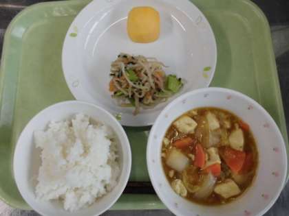 献立 ご飯、豆腐のカレー煮、三色ナムル、柿、牛乳
