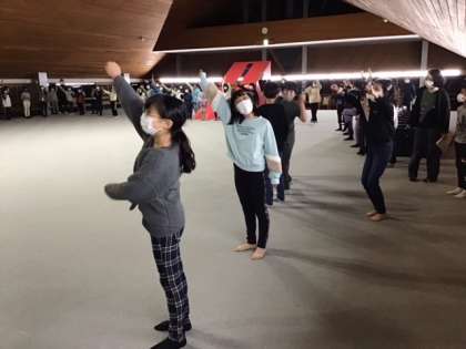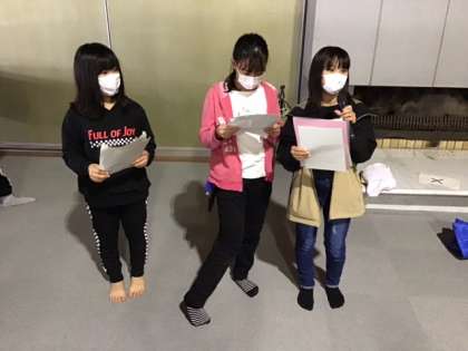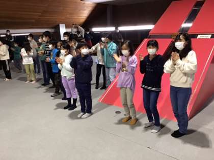 夕食の時間から、雨が降り出しました。キャンプファイヤーに代えて、全員で室内レクをします。