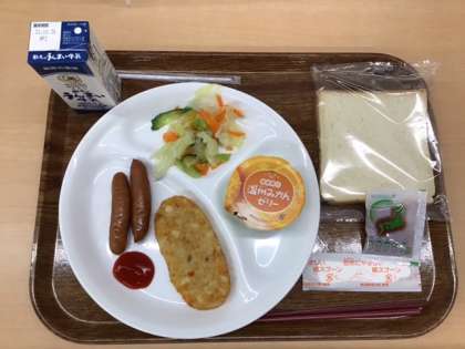 2日目の朝食は、パンにジャム、ウインナー、ハッシュドポテト、みかんゼリーなどです。よく食べています。