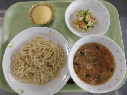 献立 みそつけめん、キャベツの中華甘酢サラダ、マーラーカオ、牛乳