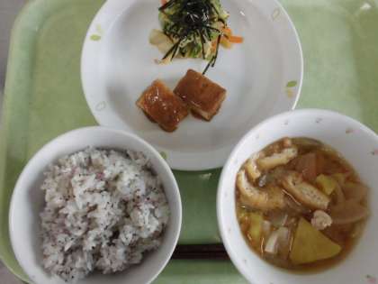 献立 ゆかりご飯、生揚げのごまだれかけ、小松菜ののり酢和え、さつま汁、牛乳
