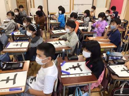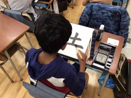 習字の時間です。今日の題字は、「土」です。まずは、基本をしっかり身につけましょう。