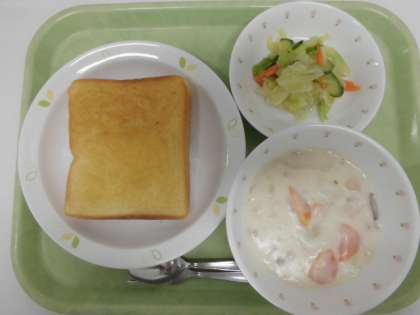 献立 メープルトースト、サーモンクリームシチュー、野菜のドレッシングかけ、牛乳