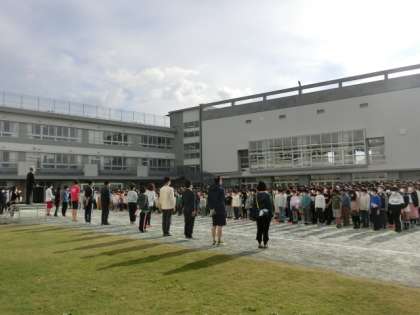 今朝は1年半ぶりに校庭に集まり、みんなで全校朝会を行いました。