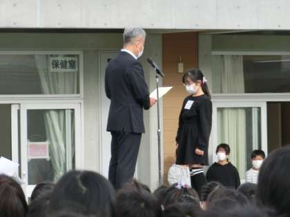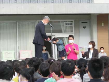 今朝は4年生の児童がピアノの演奏会で、1年生が地下鉄の絵画コンクールで良い成績を収めたので、その表彰が行われました。