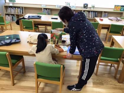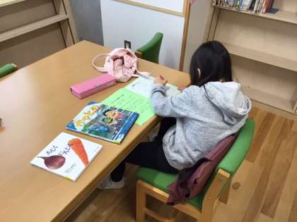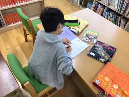 読書の時間です。借りる本を読書カードに記入しています。読んだ本が増えましたね。