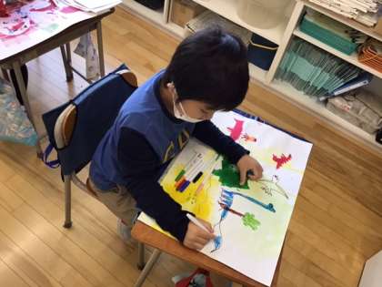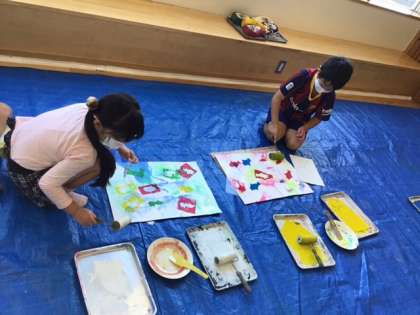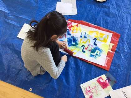 図工の時間です。「いっぱい うつして」カラフルな版画に挑戦しています。すてきな作品に仕上がりましたね。