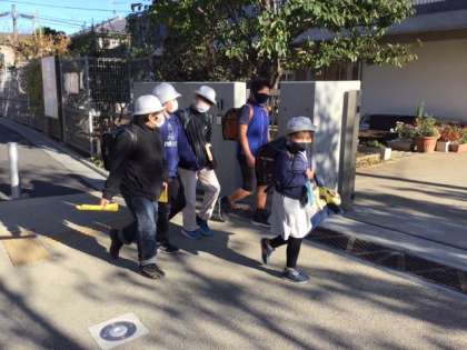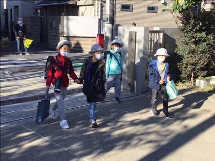 正門の登校風景をお送りします。今朝は児童集会があるので、子どもたちはウキウキしながら登校しています。