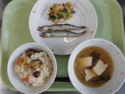 献立 吹き寄せおこわ、焼きししゃも、白菜のおかか和え、生揚げとわかめのみそ汁、牛乳