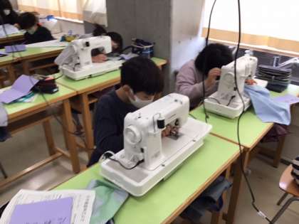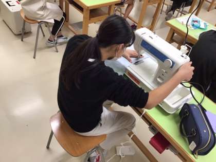 家庭科の時間です。ミシンに挑戦しています。ミシンの使い方をしっかり守ることが大事ですね。
