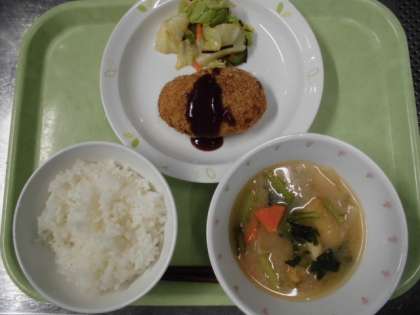 献立 ご飯、ツナコロッケ、昆布キャベツ、大根と小松菜のみそ汁、牛乳