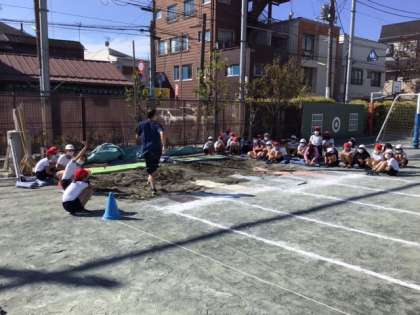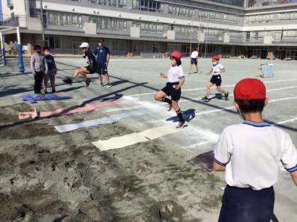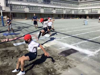 体育の時間です。走り幅跳びに取り組んでいます。力強い踏み切りがポイントです。
