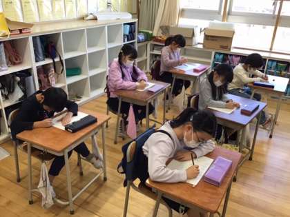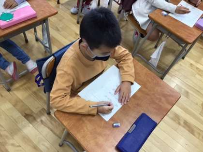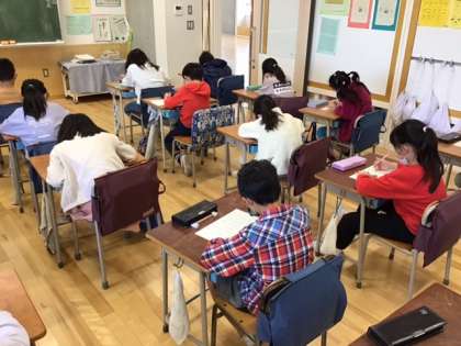 今日は朝の時間を使って、漢字テストに挑戦しています。送り仮名も正しく書きましょう!
