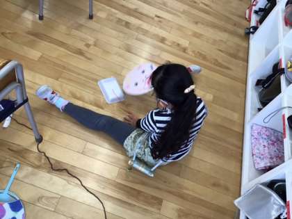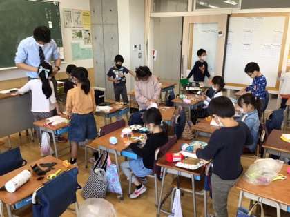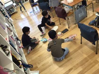 図工の時間です。「ふわふわ ゴー」風で動くおもちゃを作っています。どんな動き方をするのか、楽しみですね。