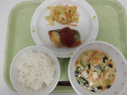 献立 ご飯、白身魚のチリソース、野菜の甘酢和え、かきたま汁、牛乳