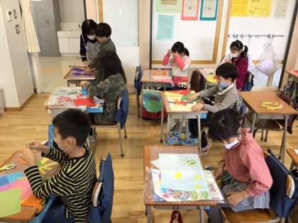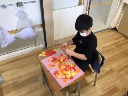 図工の時間です。「のりのり おはながみで」並べて、重ねて、好きな感じを見つけましょう!