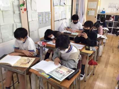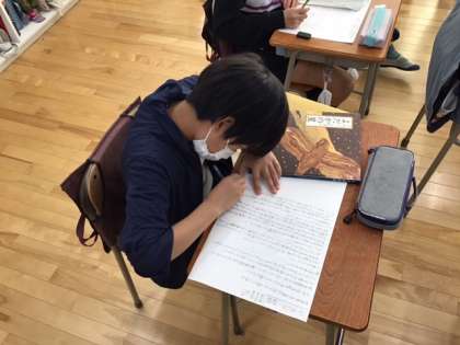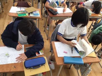 国語の時間です。「宮沢賢治新聞」作成中です。学習を通して、学んだことや自分が考えたことを詳しくまとめています。
