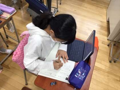 国語の時間です。考えが伝わる書き方を工夫して、グラフや表を用いて相手に伝えます。