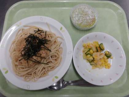 献立 ツナおろしスパゲッティ、キャロットソースサラダ、小松菜とチーズのケーキ、牛乳