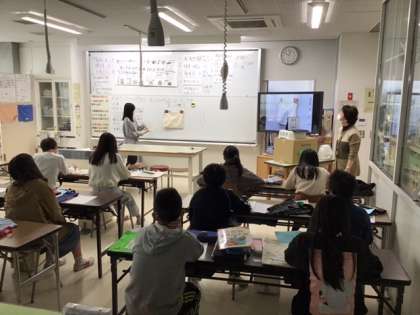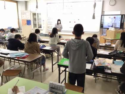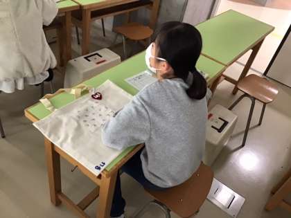 家庭科の時間です。マイバッグが出来上がりました。発表会をして、お互いの作品の良さを伝え合っています。