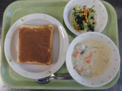 献立 きなこバタートースト、さつま芋シチュー、ほうれん草とコーンのサラダ、牛乳