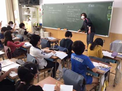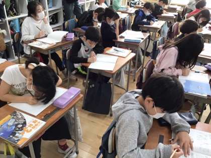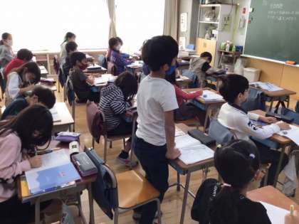 理科の時間です。「鏡で跳ね返った日光は、どうやって進むのか」これから実験に取り組みます。