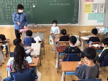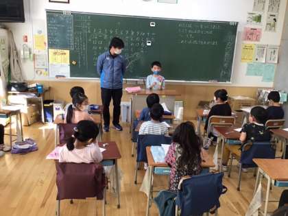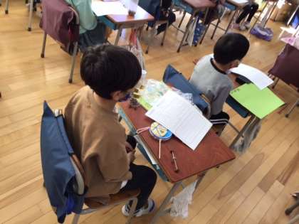 生活科の時間です。おもちゃ作りの発表会をしています。工夫やがんばったところを発表しています。