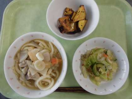 献立 しっぽくうどん、じゃこサラダ、大学芋、牛乳