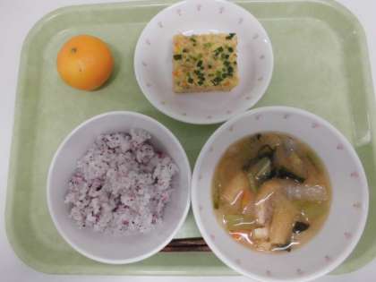 献立 ゆかりご飯、切り干し大根入り卵焼き、野菜のみそ汁、みかん、牛乳