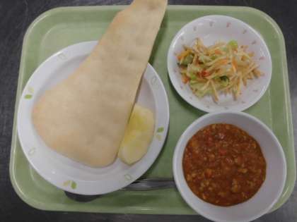 献立 ナン、チキンキーマカレー、じゃがいものハニーサラダ、りんご、牛乳