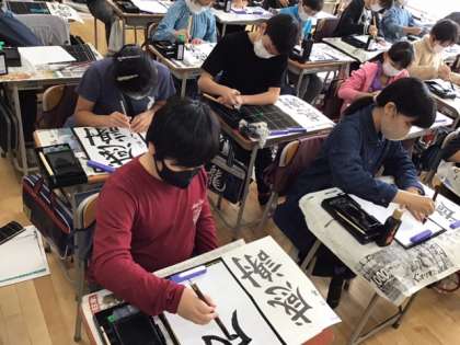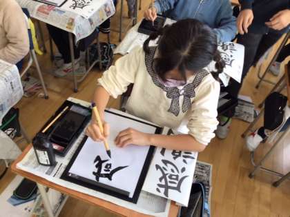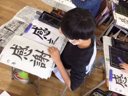 習字の時間です。今日の題字は、「感謝」です。バランスを取るのが難しい字ですね。