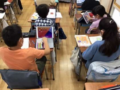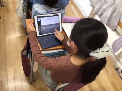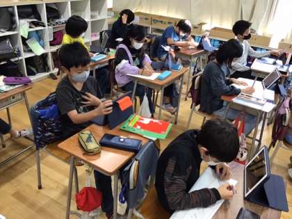 国語の時間です。伝統工芸品を紹介するリーフレットを作成しています。