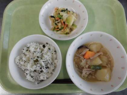 献立 わかめご飯、塩肉じゃが、サクサク高野豆腐のサラダ、牛乳