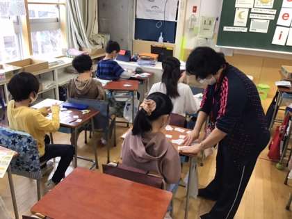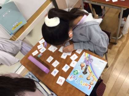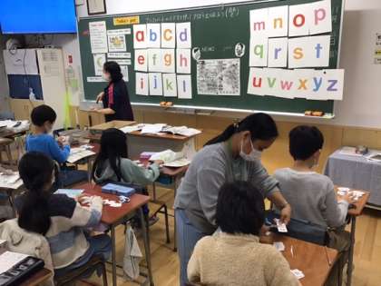 外国語活動の時間です。アルファベットの小文字を使って、クイズを出し合います。