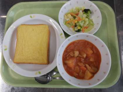 献立 豆乳フレンチトースト、チキントマトシチュー、ブロッコリーサラダ、牛乳
