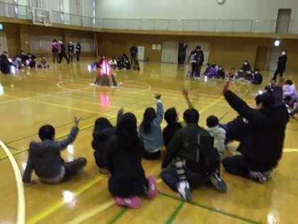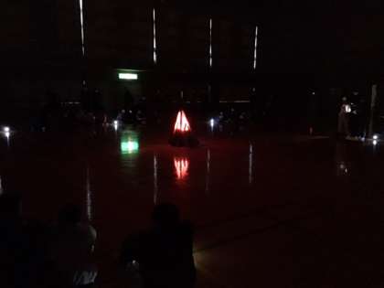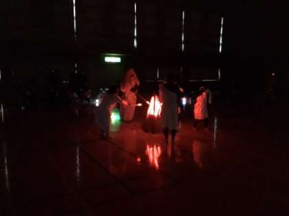 体育館で、キャンドルファイヤーが始まりました。点火方法も趣向が凝らされています。