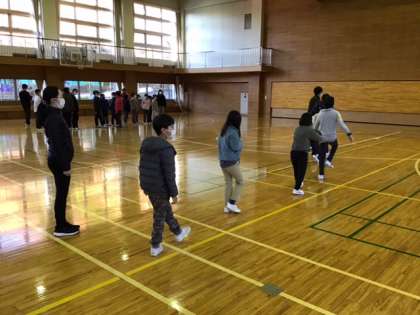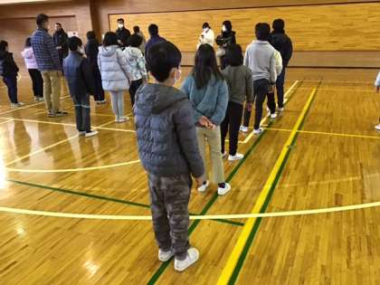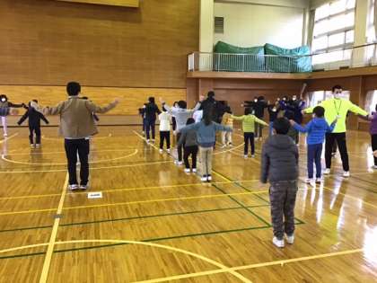 8校の全員が集合して、朝の会です。ラジオ体操で体を動かし、今日のハイキングに備えます。
