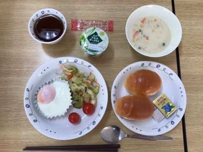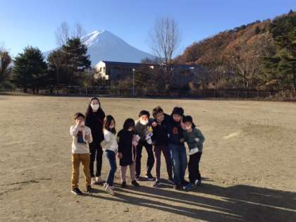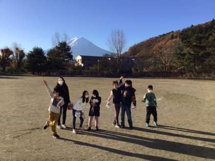3日目の朝食の時間になりました。富士山を背景にして、記念の一枚を撮りました。