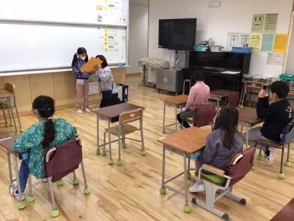 今日は、2年生が日直です。1日の予定や給食の献立を伝えています。
