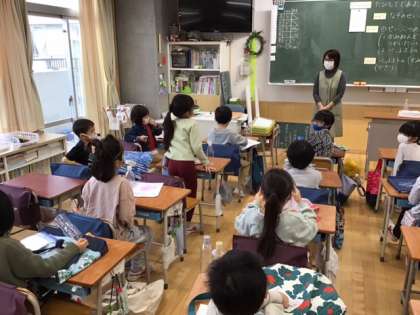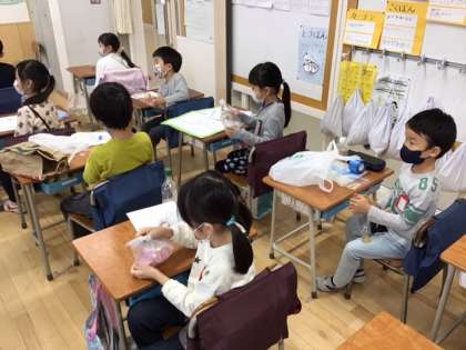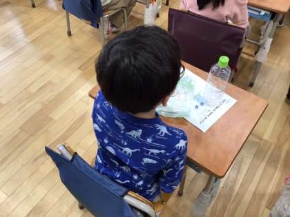 図工の時間です。「たびして であった なぞのせいぶつ」どんな謎の生物ができるのかな?