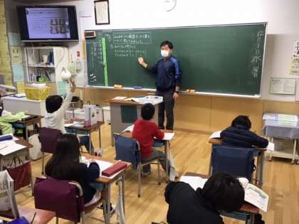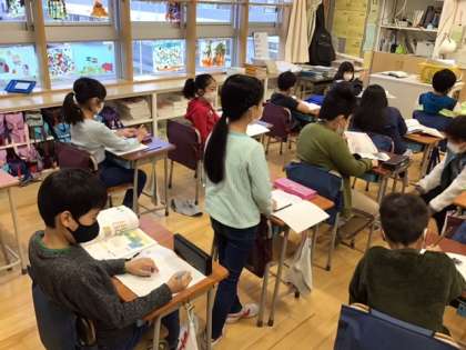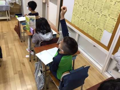 算数の時間です。身の回りの場面を、かけ算を使って考えています。
