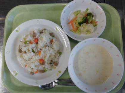 献立 ハムピラフ、コーンポタージュ、花野菜サラダ、牛乳