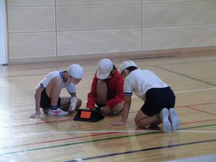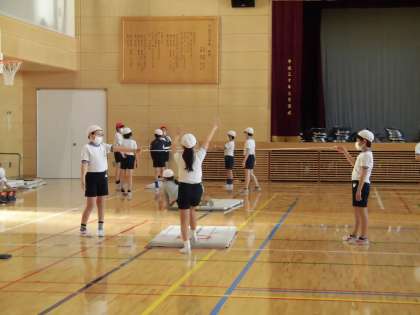 体育館体育の時間には、マット運動に取り組んでいます。