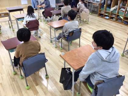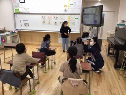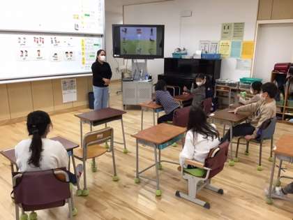 外国語活動の時間です。動詞を中心にたくさん練習して、どんどん英語に慣れています。