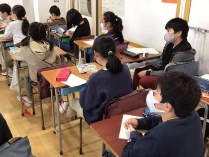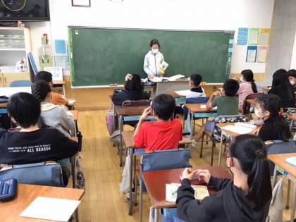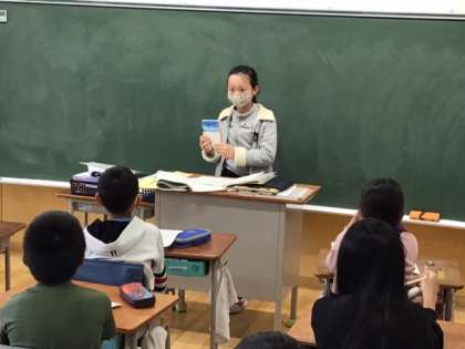 国語の時間です。「一冊の本から ービブリオバトルー」友達に本の魅力が伝わるように、内容を工夫して発表しています。