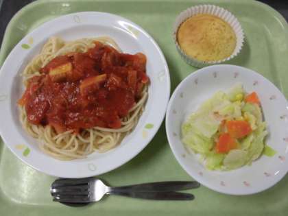 献立 きのこのトマトソーススパゲッティ、キャベツとコーンのサラダ、ぐりとぐらのかすてら、牛乳