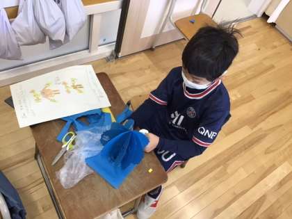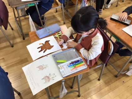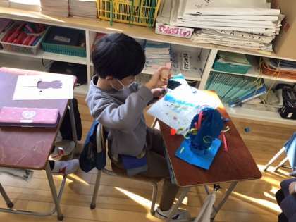 図工の時間です。「カッターナイフツリー」が完成した人は、下北沢ゆるキャラづくりに取り組んでいます。