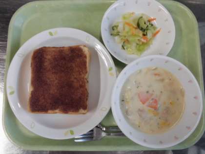 献立 ココアトースト、クリームスープ、フレンチサラダ、牛乳