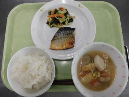 献立 ご飯、さばの塩焼き、わかめ入りお浸し、打ち豆汁、牛乳