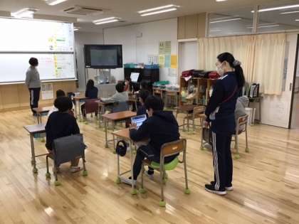 朝の会、日課帳のあと、グループ学習になりました。時計の学習や6年生を送る会の練習に取り組んでいます。